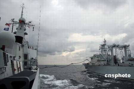 A Chinese naval fleet en route to the Gulf of Aden and waters off Somalia for an escort mission against pirates completed its first replenishment at sea Tuesday. The fleet, two destroyers and a supply ship, has entered the Indian Ocean after a four-day voyage which set sail from China's southernmost island province of Hainan. In the afternoon, the supply ship Weishanhu successfully refueled the two destroyers Wuhan and Haikou with several hundred tons of oil, an operation that an official for fleet support described as "highly efficient." The fleet will cruise for about 10 days before arriving in the Gulf of Aden to join a multinational patrol in one of the world's busiest sea lanes endangered by surging piracy. The recent pirate attack on a Chinese fishing vessel has raised great concern of the Chinese government and people. Statistics showed that some 1,265 Chinese commercial vessels have passed through the gulf so far this year and seven have been attacked. The UN Security Council has adopted four resolutions calling on all countries and regions to help patrol the gulf and waters off Somalia since June. The latest resolution authorized countries to take all necessary measures in Somalia, including in its airspace to stop the pirates. |