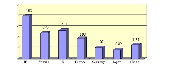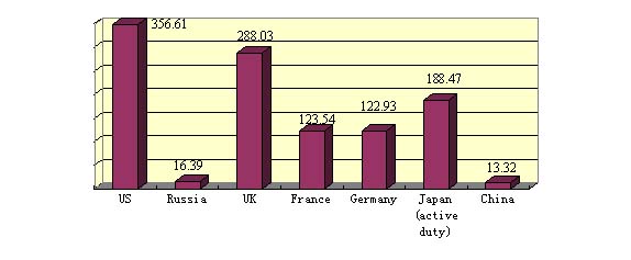 (Xinhua) Both the total amount and per-serviceman share of China's defense expenditure is low compared with those of some other countries, particularly major powers. In 2005, China's defense expenditure equaled 6.19 percent of that of the United States, 52.95 percent of that of the United Kingdom, 71.45 percent of that of France and 67.52 percent of that of Japan. China's defense expenses per serviceman averaged RMB107,607, amounting to 3.74 percent of that of the United States and 7.07 percent of that of Japan. China practices a strict system of financial appropriation of defense funds . The PLA's budgeting is based on the defense development strategy, military building objectives and annual military tasks set by the state. Budgeting units at each level carry out studies to decide on their budget items, make calculations of their requests for funds and then report to the next-higher authorities. The General Logistics Department, working with the relevant departments of other general headquarters/departments, analyzes, calculates and verifies the annual budget requests submitted by all the military area commands, the Navy, Air Force and Second Artillery Force, and draws up the defense budget. After being reviewed and approved by the CMC, the defense budget is submitted to the Ministry of Finance. The latter, on the basis of medium- and long-term fiscal plans and the estimated revenue of the year, puts forward a plan for military expenditure appropriations after consultation with the General Logistics Department, and then incorporates it into the annual financial budget draft of the central government. Upon approval by the State Council, the annual financial budget is submitted to the Budget Work Committee of the NPC Standing Committee and the Finance and Economic Committee of the NPC for review before it is submitted to the NPC for review. After the budget of the central government is approved by the NPC, the Ministry of Finance informs in writing the General Logistics Department of the approved defense budget. The defense budget is then implemented down to troops at different levels through prescribed procedures. Financial departments are instituted at the General Logistics Department, military area commands, Navy, Air Force and Second Artillery Force, and units at the levels of corps, division (brigade) and regiment. These departments are responsible for the appropriation, management and supervision of the defense funds. The auditing offices of the state and the PLA conduct strict supervision of the defense budget. Chart 4: Comparison of Defense Expenditures of Major Countries in 2005 (unit: US$ billion)
