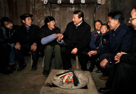 Xi Jinping (C), member of the Standing Committee of the Political Bureau of the Communist Party of China (CPC) Central Committee, talks with local residents plagued by freezing weather in Yuping County, a Dong ethnic group residential area in Guizhou Province January 31, 2008. [Xinhua]
