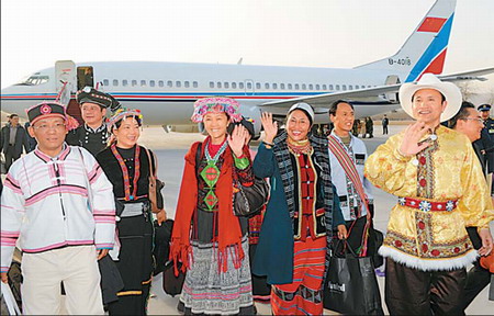 Delegates to the First Session of the 11th CPPCC National Committee, from Yunnan province, wave to onlookers at Beijing Xijiao Airport on Thursday. [Xinhua]