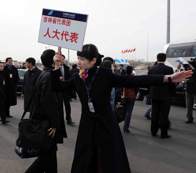Zhang Mengheng, a ground service worker of China Southern Airlines, helps NPC deputies from Jilin Province at an airport in Beijing March 2, 2008. NPC deputies are arriving in Beijing for the annual session of the lawmakers. [Xinhua]
