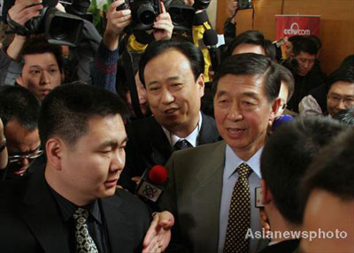 Wu Jianmin, spokesman for the first session of the 11th Chinese People's Political Consultative Conference, is surrounded by reporters after a press conference in the Great Hall of the People March 2, 2008. The CPPCC session will open on Monday. [China Daily]