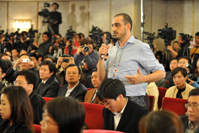 A foreign correspondent raises a question to Wu Jianmin, spokesman for the first session of the 11th Chinese People's Political Consultative Conference at a press conference in the Great Hall of the People March 2, 2008. The CPPCC session will open on Monday. [Xinhua]