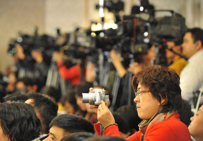 A correspondent photograhs at a press conference by Wu Jianmin, spokesman for the first session of the 11th Chinese People's Political Consultative Conference in the Great Hall of the People March 2, 2008. The CPPCC session will open on Monday. [Xinhua]