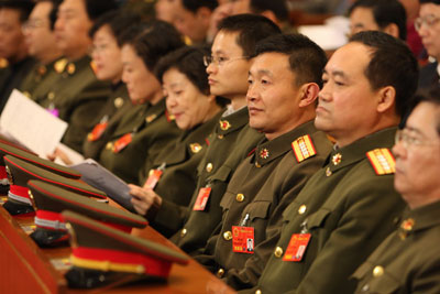 Deputies from the military attend the preparatory meeting of the First Session of the 11th National People's Congress at the Great Hall of the People in Beijing March 4, 2008. The meeting elected a presidium and set the agendas for the annual session. [Xinhua]