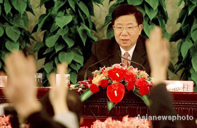 Jiang Enzhu, spokesman for the First Session of the 11th National People's Congress, hosts a press conference in the Great Hall of the People in Beijing March 4, 2008. [Asianewsphoto]