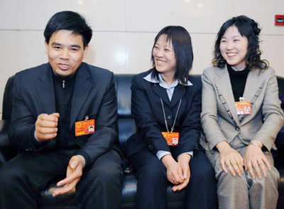 Hu Xiaoyan (C), Zhu Xueqin (R) and Kang Houming, deputies to the first session of the 11th National People's Congress representing the country's migrant population, talk about their proposals to be submitted to the session in Beijing March 4, 2008. [Xinhua]