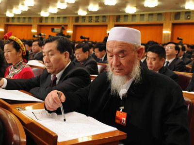 NPC deputies listen to Premier Wen Jiabao delivering his government work report at the Great Hall of the People in Beijing March 5, 2008. [Xinhua]