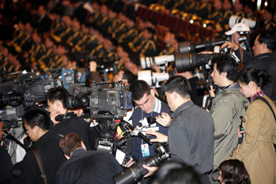 Photo and TV journalists work to cover the first session of the 11th National People's Congress in the Great Hall of the People in Beijing March 5, 2008. [Xinhua]