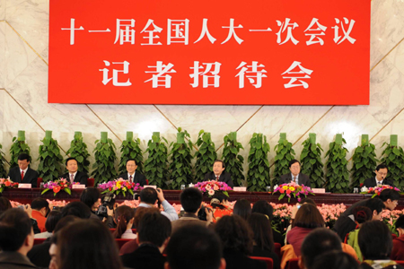 A press conference on economic and social development and macroeconomic control is held by the First Session of the 11th National People's Congress (NPC) at the Great Hall of the People in Beijing March 6, 2008. [Xinhua]