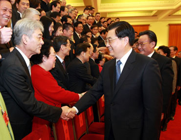 President Hu Jintao (R) and other top leaders greet NPC deputies and CPPCC members from Hong Kong and Macao in the Great Hall of the People in Beijing March 6, 2008. [Xinhua]