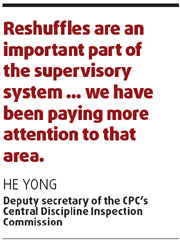 By Jiao Xiaoyang (China Daily) Updated: 2008-03-08 09:25 The Communist Party of China (CPC) will introduce more frequent reshuffles of disciplinary officials to avoid nepotism, a senior Party watchdog said on Friday. He Yong, deputy secretary of the CPC's Central Discipline Inspection Commission (CDIC), said: "The exchange (of supervisory officials) from time to time is good because those who have been in the same job for a long time build up too many connections, which can be detrimental to their work."