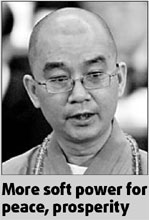 The nation should put more emphasis on "soft power", Xue Cheng, CPPCC member and vice-president of the Buddhist Association of China, said yesterday. The term "soft power" was coined in the late 1980s by Harvard professor Joseph Nye to describe the use of a country's culture and ideology to indirectly influence behavior. "Buddhism, Confucianism and Taoism are three cornerstones of traditional Chinese culture that contribute to its harmonious character," Xue said. Chinese Buddhists have been working to introduce Buddhism to other countries and to help more nations, ethnic groups and civilizations understand Chinese culture, he said. The country's wide range of cultural resources can be leveraged as "soft power" to contribute peace and prosperity to the world, he said.