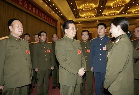 Chinese President Hu Jintao (C), who is also general secretary of the Communist Party of China (CPC) Central Committee and chairman of the Central Military Commission, talks to the deputies of the Chinese People's Liberation Army (PLA) to the First Session of the 11th National People's Congress (NPC) in Beijing, capital of China, March 10, 2008. Hu Jintao attended the plenary meeting of the PLA delegation and made a speech on Monday. [Xinhua]