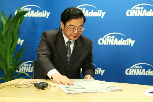Hunan Governor Zhou Qiang reads China Daily newspaper prior to an exclusive interview by chinadaily.com.cn March 11, 2008. [chinadaily.com.cn]