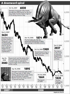 But like countless investors in the country, the 56-year-old retiree has seen over 60 percent of her hard-earned 320,000 yuan ($46,900) evaporate in the unexpected market mayhem now taking place. "I've been tortured for an entire year, and am glad that the wretched 2008 finally ended," Shang said. She ventured into the stock market in 1993 with 3,000 yuan. That year, urban per capita annual income was only 2,337 yuan. Her appetite for more investment returned and started swelling when the value of the money she put into the market doubled in 2007. Unfortunately, her dreams were shattered, after tumbling through the turbulence in the stock market and one of the biggest overall falls ever seen in the history. The leading indicator plummeted 72 percent from an all-time high of 6,124 points in October 2007 to a low of 1,664 points a year later. The market value shrank from 32.76 trillion yuan on Jan 2 to 9.7 trillion yuan by the end of the year, making it the worst performer in the global market meltdown. As for the new year just begun, industry experts and investors hold diverse opinions. "We forecast the leading indicator will hover between 1,650 points to 2,700 points, given the growth rate of corporate profit will be likely to fall to negative 10 percent," said Wu Feng, an analyst with TX Investment Consulting.