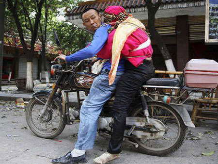 Wu Jiafang, became a disaster hero after the May 12 earthquake for trying to preserve the dignity of his dead wife. He was photographed with her body tied to him while he was on his motorbike. After retrieving her from the quake's rubble, he wanted to drive her body to their home and bury her there. Wu's image came to represent the heroic, selfless acts of many during the earthquake including policewoman Jiang Min. She continued to help quake-victims despite losing 10 family members. There was also middle school teacher Tan Qianqiu who sheltered his four students from quake debris with his arms. As time goes by, their faces still linger in the memory of the Chinese people who were deeply impacted by what happened in Sichuan. -- Zhou Zhenglong