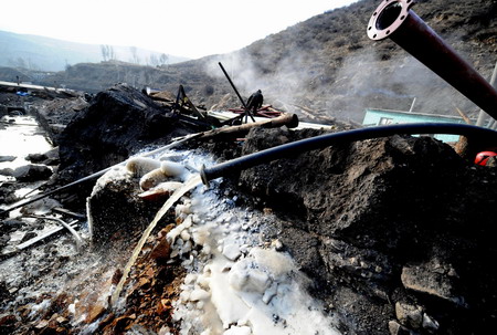Updated: 2009-01-05 11:54 ![]() Pump draws water from a coal mine pit in north China's Shanxi Province, Sunday, January 4, 2009. A concealed mine flood there, December 5, 2008, killed 4, local authorities said on Sunday. [Xinhua]