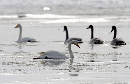 ![]() Swans swim on the Heihe River in Gaitai, Northwest China's Gansu province, Januray 5, 2009. As local environment keeps improving, more and more swans have arrived in the middle and lower reaches of the Heihei River to spend winter. [Xinhua]