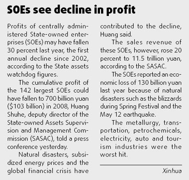 "The slowing trend, which began in the second half of 2008, will continue this year," Xie Xuren told a working conference. "The conflict between unbalanced income and spending will be prominent this year." Last year's fiscal revenue might have crossed 6 trillion yuan ($878 billion), up 19 percent over 2007, Xie said. The growth rate was 33.3 percent for the first half, when the global financial crisis broke out. Government expenditure on rural development, education, healthcare and social security last year could have risen 38 percent, 47 percent, 25.2 percent and 19.9 percent, he said. The figures are statistical estimates because the official data for 2008 are yet to be released. The fiscal income growth has slowed since the second half as the worsening economic climate hurt corporate profitability and investment, he said. The combined profit of the 142 largest State-owned enterprises is likely to have fallen 30 percent to 700 billion yuan last year, the first drop since 2002, the State-Owned Assets Supervision and Administration Commission said (see box below). Last year, the government raised the level of tax rebates to bolster exports, reduced taxes on house purchase to support the real estate market, and cut interest on savings and stamp duty of stock trading to boost the financial market. The slowing of fiscal revenue growth could be partly attributed to these moves. Analysts said a weaker fiscal prospect meant the country's budget deficit would balloon further this year, proving critical for financing the government's $586-billion stimulus package.