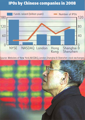 "Given the growing uncertainties in the economy and capital market, individual investors now prefer speculative buying rather than being long-term holders," he said. The average P/E ratio of new listings this year would be around 20 to 30, compared with the current 15 P/E ratio of A-shares, the report said. "Market sentiment is expected to remain weak in the first half of this year, and we expect most of the new listings in the second half," said Charles Feng, lead partner in the Beijing office of PricewaterhouseCoopers. China's stock market went through a significant adjustment last year, amid the global financial turmoil and economic recession. The benchmark Shanghai Composite index fell nearly 70 percent last year. The combined total IPO funds raised in Shanghai and Shenzhen stock exchanges fell 78 percent last year from the 2007 levels of 477.1 billion yuan. In 2008, the amount of funds raised through IPOs accounted for about 33 percent (vs. 62 percent in 2007) of the total equity funds (312.7 billion yuan as of Nov 30, 2008) raised in Shanghai and Shenzhen. Placements, rights issues and consideration issues of listed companies accounted for the balance 67 percent. The total number of IPOs in the two stock exchanges was 77 including 6 in Shanghai (25 in 2007) and 71 in Shenzhen (101 in 2007), falling 39 percent from 2007. Out of the 77 IPOs in 2008, there were only three A-shares issued by H-share companies listed on the Hong Kong Stock Exchange, while there were 12 in 2007. "But we are still expecting three or four domestic enterprises to adopt a dual listing mode (A+H shares) this year," said Feng. "But many of the Chinese companies which are registered and listed in Hong Kong may not return to the Shanghai bourse this year as the mainland market may not be as attractive as it used to be in 2007." |