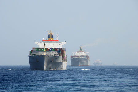 Updated: 2009-01-06 23:59 Four merchant vessels sail in a line formation under command of the DDG-169 Wuhuan destroyer in the Gulf of Aden, January 6, 2009. [Xinhua] |