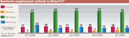 ![]() In addition, employers in Shanghai, Beijing and Guangzhou reported their weakest hiring intentions since the first quarter of 2007, a report conducted by Manpower showed. The Manpower Employment Outlook Survey is conducted quarterly to measure employers' intentions to increase or decrease the number of employees in their workforce during the quarter.