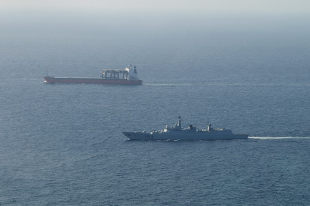 A Chinese missile destroyer Wuhan (R) escorts Taiwan merchant vessel Yushan through Somali waters January 12, 2009. This is the second escort mission conducted by the Chinese navy at the anti-piracy mission area. The Chinese naval fleet of two destroyers and a supply vessel have been patrolling the Somali waters for the past week and offered to escort ships from the Chinese mainland, Hong Kong, Macao and Taiwan on request. [Xinhua]