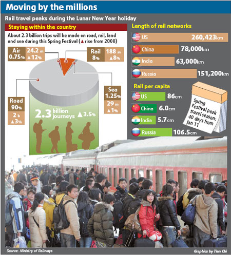 As railways have the advantage of lower prices, trains are also the top choice of transport for many travelers. Whenever railway capacity is increased, the added capacity is usually swiftly taken up by demand, Wang said. According to Beijing Jiaotong University's Ji Jialun, train tickets also cost less than long-haul buses. For example, a 500-km bus trip from Beijing to Heze in Shandong province costs 200 yuan, but the train ticket for the same journey is only a little above 40 yuan, he said. The train tickets are low because the railways are run by the government and people tend to regard it as a public welfare entitlement, he said. To solve these "fundamental problems", the railway administration is now speeding up the construction of railways and aiming to extend the railway network to 120,000 km by 2020. "When China's railways stretch to 100,000 km long by 2012, it could ease the pressure during the chunyun period," Minister of Railways Liu Zhijun told an annual working conference on Dec 31. A fast passenger transport network will take shape by then, with bullet trains going at 200 to 350 kmh on tracks parallel to that of cargo transport. Despite all these solutions provided by the ministry and experts, many are reportedly still unhappy with the current ticket distribution procedure, saying it is not transparent and open. A survey by Sina.com earlier this month showed 47.3 percent of the respondents believed securing a train ticket in the chunyun period required "influence and unfair advantages". |