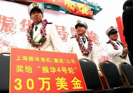 Each crew member of the cargo ship, Zhenhua 4, was being rewarded for their bravery and courage, said Guan Tongxian, president of Shanghai Zhenhua Port Machinery Co..