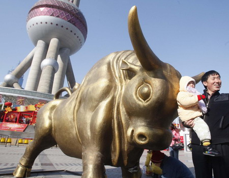 ![]() Tourists pose for photographs besides an Ox statue with the landmark tower of Shanghai Oriental Pearl in the background, celebrating the upcoming Chinese Lunar New Year of Ox, in Shanghai Saturday, January 24, 2009. [Xinhua]