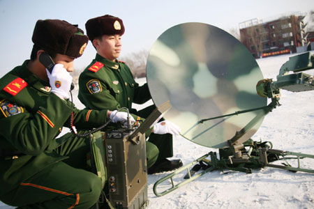 ![]() Armed policemen operate a communication device during an anti-terrorist drill held in Harbin, Northeast China's Heilongjiang Province, February 2, 2009. [Xinhua]