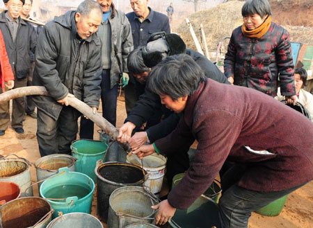 Farmers barrel drinking water supplied by the local government at Chengguan Township in Ruyang County of Luoyang, central China's Henan Province, February 4, 2009. Effective rainfall was nearly 80 percent less than in the same period of previous years. The local government has allocated some 25 million yuan (US$3.65 million) for drought relief and crops protection. [Xinhua]