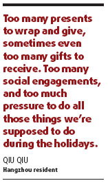 Online shopping websites, such as eBay and Taobao, are offering thousands of "resold goods", including food, beverages, cigarettes and small appliances, at low cost. Meanwhile, some people are bartering instead of buying and selling, in the hope of picking up something they want. In addition, many of those who use these websites have posted messages critical of themselves for being weak and adding to the conspicuous consumption and waste of the holiday. "Too many presents to wrap and give, sometimes even too many gifts to receive. Too many social engagements, and too much pressure to do all those things we're supposed to do during the holidays," Qiu Qiu, a resident from Hangzhou, Zhejiang province, said. "Excepting the goods for family use, I have to spend at least 10,000 yuan ($1,463) on gifts for friends, although I know some recipients don't need the gifts," she said. Although prices are favorable, the consumer protection department advises consumers to be aware of the products' shelf lives, especially foods and beverages, and to ask for a warranty card and receipt when buying electrical household appliances. |