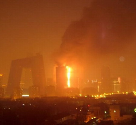 ![]() The north wing building of the new CCTV tower is on fire, which is still spreading, in downtown Beijing Monday February 9, 2009. Police have conducted traffic control around the scene. [people.com]