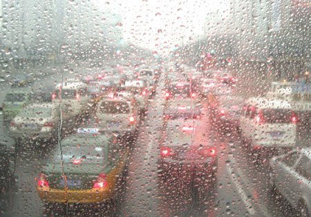 ![]() Photo taken on February 12, 2009 shows vehicles on a street seen through a piece of glass covered with raindrops in Beijing. Beijing welcomed its first rain in 110 days on Thursday morning, but experts say it was too little to end the city's lingering drought. [Xinhua]