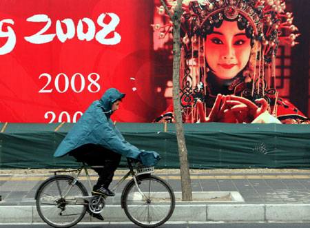 Updated: 2009-02-12 21:41 ![]() A man in raincoat rides on a road in Beijing, February 12, 2009. Beijing welcomed its first rain in 110 days on Thursday morning, but experts say it was too little to end the city's lingering drought. [Xinhua]