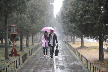A young couple with umbrella walks in a park in Beijing, February 12, 2009. Beijing welcomed its first rain in 110 days on Thursday morning, but experts say it was too little to end the city's lingering drought. [Xinhua]