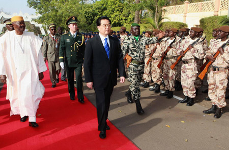 He made the promise in a written statement after arriving in Mali's capital Bamako Thursday. He will undertake a two-day state visit to the country from Thursday. The trip is widely expected to significantly push forward China-Mali ties, expand pragmatic cooperation between the two countries and open a new chapter in bilateral friendship. During his visit, he will exchange views with Mali President Amadou Toumany Toure over bilateral relations, and regional and international issues of common concern. He will also meet with the President of the Malian National Assembly Dioncounda Traore. He will attend the opening of the Bamako No 3 Bridge and unveil the new malaria treatment medical center. Both projects were built with Chinese assistance. Mali is the 15th African country in which Hu has set foot since becoming president in 2003. It was also one of the first African countries to establish official relations with China. For 49 years, China-Mali friendship has remained strong and their cooperation in all fields fruitful, Hu said in the statement. According to the trade and commerce section of the Chinese embassy in Mali, bilateral trade has been on an upward curve, touching a record high of $230 million in 2008. While cotton and other agricultural byproducts are shipped from Mali to China, machinery, tea and textiles flow in the opposite direction. |