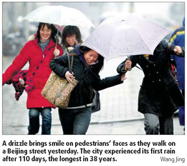 Updated: 2009-02-13 08:07 Mild rainfall brought some relief to farmers in the country's drought-hit areas yesterday, with Beijing too getting its share. The rain could push down the unusually high temperatures in North China by 4C to 6C today, the National Meteorological Center (NMC) said.