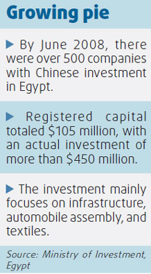 Even as domestic enterprises start to feel the pinch from deepening credit woes caused by the global downturn, Li has been busy dealing with rising orders from the US and European markets. Li's former colleagues in China have started to close factories. Some of them are experiencing sluggish business growth. Yet, Li is sitting pretty. "Orders from the US have increased by 60 percent year-on-year since November," Li said. "Our hands are full." Low costs have been his main reason for cheer, said Li, the general manager of Nile Textile Group, a garments manufacturer based in Port Said, some three hours drive from Cairo. Inexpensive raw material and inputs, low labor costs and favorable government policies have reduced the cost of making clothes, much lower than even China, long known for producing cheap goods. Before coming to Egypt, this 55-year-old used to work for a State-owned trading firm in Jiangsu province, a major manufacturing and export base in China. Then, in 1999, Chinese textile companies encountered tough times due to the import quota system followed by the EU and US. The policy spelt out that textile makers from China could export only limited quantities of textile products to these two markets. However, the Chinese textile industry had become hugely competitive by then. Thousands of textile companies were competing for a share of the pie arising from the limited quota. This was narrowing their profit margins. That was when Li decided to head to Egypt. There were no restrictions on exports there, he had heard. He took 29 of his colleagues with him and set up the first ever textiles company to be funded by a Chinese, in Egypt. "It was a tough start," Li recalled. They did not understand the local language, and it took them eight days to build their first tent and settle down. Gradually, things started to improve. Li realized labor costs in Egypt were much lower than in China. A textile worker in southern China is paid around 1,500 yuan a month. In contrast, the monthly salary of a worker in Egypt was equivalent to only around 650 yuan. Li soon started to hire people locally. Now, there are around 600 Egyptians working in his factory. The Chinese government had restricted energy consuming industries over the years and lowered the export tax rebate on textile products several times in 2007. On the other hand, Egypt was encouraging the textile industry in a bid to improve local employment levels. The cost of raw material and inputs were lower as well. For instance, the water and electricity costs in Egypt were among the lowest in the world. In the free trade zone where Li's company is located, the electricity charges were around $0.03 per kilowatt, and that of water, $0.15 per cu m. "The cost of a steam boiler in Egypt is around 100 yuan a day, but will cost at least 3,000 yuan a day in China," said Li. In addition, Egypt had signed free trade agreements with Europe, the US and some Arab nations. That meant zero tariffs for exports to these countries, said Ahmed Amin, vice-chairman of General Authority for Investment and Free Zones of Egypt. "Sometimes, products made in China cannot gain access to foreign markets due to market barriers, but if you make the products in Egypt, there would be no such problem," Amin pointed out. For example, Chinese products exported to the US attract duties of around 30 percent. In Egypt, there is no such levy. "The cost is much lower. That will make these textile enterprises even more competitive," he said.