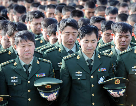 Updated: 2009-02-14 19:50 Firefighters mourn the death of Zhang Jianyong, who died Monday when battling a fire at the new China Central Television (CCTV) headquarters, Beijing, February 14, 2009. [Xinhua] |