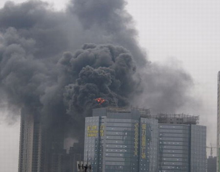 Witnesses said the fire started at about 11 a.m. with thick smoke on top of the Fuli Yingtai Plaza in the Tianhe District. The blaze was put out about 10 minutes later. Six fire engines were dispatched for the rescue operation. Scaffolds are seen outside the building. Local residents said it is under construction and yet to be put into use. A fireman said an air-conditioner on the top floor caught fire first and then spread to the building, but the blaze did not spread to other floors. |