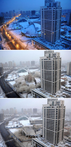A combination of photographs shows a water amusement center called "The Summer Palace" falling in a demolition blast in Shenyang, Liaoning province, February 20, 2009. The landmark dome structure was dismantled to make way for construction of a new property development after serving 15 years as a fun place for local residents. [Xinhua] |