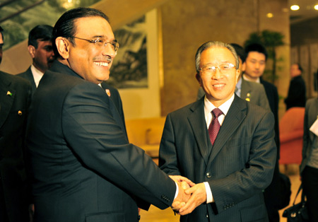 "To promote the development of Sino-Pakistani friendship is our unswerving policy," Dai said, noting that the country always treated relations with Pakistan from a strategic height and a long-term perspective. Dai hoped the two countries would upgrade the bilateral relations into a new level. Zardari spoke highly of the Pakistan-China diplomatic relations, saying that the two nations had increasingly cemented traditional friendship and expanded cooperation in various areas in the past 50-odd years. The president said Pakistan was grateful for China's support to its economic and social progress. The Pakistani government would continue its friendly policy towards China, and make joint efforts with the country to deepen the mutually-beneficial cooperation in economy, trade, energy, agriculture and finance, Zardari told Dai. Zardari and Dai also attended the signing ceremony of an agreement on trade between the two governments. Zardari accepted a joint interview with local press before meeting with Dai. He said his country and China enjoyed comprehensive relationship, not only between political parties but also between the two peoples. He expected more efforts by the two sides to lift the existing profound friendship to a new high. The president welcomed more Chinese businesses to invest in Pakistan, saying that his country had geographic advantage and its ports could help Chinese products enter south Asia. "We wish a success for the business exchanges with China," he noted.