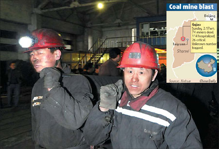 The blast occurred at 2:17 am while 436 employees of Tunlan Coal Mine were at work underground in Gujiao, 60 km west of Taiyuan, capital of the coal-rich province. Of the 114 miners hospitalized, 26 were in critical condition as of last night, officials said. More than 300 are believed to have escaped from the pit within the first hour of the blast, including many who were hospitalized, an employee who records worker flow told China Daily. He said the first batch of rescuers reached the site at around 3:20 am. A total of 57 rescuers, some from other places including Taiyuan, were involved in the rescue operation, a local police officer said. But Gujiao residents said the number was not enough. "The rescue team here with the mine is severely understaffed as the headquarters is based in Taiyuan," Kang Changqing, a former Tunlan miner who lives nearby, told China Daily. Though his village, Liangzhuang, is 3.5 km away, Kang, 46, said people there were the first to know about the blast and call police. "Two intake passages of the pit - which link to the outside and provide fresh air to the mines - were built by the road just outside my home," he said, noting that most villagers were woken up by "two tremendous explosions" at 2:18 am. As the explosions took place more than 400 m underground, mine watchers were not the first to find out about the accident, according to other villagers. "The parts of the intakes above ground were totally destroyed. Luckily for us, the explosions happened at night when no one was around," Kang said. After rescue work was suspended for the day at 6 pm yesterday, the rescue headquarters confirmed that the death toll stood at 74, without announcing the number of miners still trapped - or whether anyone was trapped at all. President Hu Jintao and Premier Wen Jiabao issued instructions for everything possible to be done to save those still trapped inside the mine, CCTV reported. Three days before the blast, Wang Jun, governor of Shanxi, when reviewing work safety procedures in Taiyuan, warned the province - which often witnesses coal mine disasters - "had run out of tears to shed". After climbing out of the deadly pit, some rescuers wasted no time calling home on their cellphones. "If I don't call them immediately, they would start worrying about my safety and mental health," a rescuer surnamed Zhao told China Daily. "My family might have thought I had gone crazy after going through all this every time," he said. Zhao, part of the provincial mine rescue team, began work immediately after reaching the pit in the morning and did not came out till 5:30 pm. The Tunlan mine, which has an annual capacity of 5 million tons, is operated by the Shanxi Jiaomei Group. Yesterday's death toll makes it the most lethal accident reported in the mining industry after 276 people died in the collapse of an unlicensed iron ore reservoir last September, also in Shanxi. |