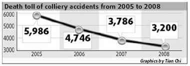 An official from the local bureau of mines was also reported as saying that no one was missing. But anxious relatives who gathered in Gujiao were left in confusion because they were not told if their loved ones were dead or among the injured. Some believe that there are still miners trapped underground, and were pleading for rescue work to be continued. The earliest batch of relatives arrived on the site around noon on Sunday and were sent to six or seven different hotels, motels and hostels, each closely monitored by mine staff. About 50 people were sent to a shabby two-story brick hostel of the Malan coal mine, a Tunlan affiliate. After receiving a phone call from mine officials yesterday morning, the elder brother of 42-year-old miner Li Wuzhong jumped onto a bus for the 200-km journey from Changzhi, their hometown in southern Shanxi, to the Tunlan mine. He was "advised to stay in" at the Malan hostel. "I've been told that Li's unit was down in the pit when the explosion happened," the brother, 53, said. Accompanying Li were 10 relatives, all men. Having been told to wait in a twin-room, they complained about the scant information on their beloved family member. "No one has told me whether he is alive or not," the elder Li told China Daily. The men tried their best to hold back their tears, a typical scene in all the other 18 rooms on the hostel's second floor, temporarily occupied by frustrated relatives. Looking after them were a few nurses, equipped with oxygen bottles and first-aid kits, ready to treat those who collapsed in grief. About 20 employees of the mine - mainly women - were also there, comforting the relatives, while ensuring they did not leave the premises. Back in Tunlan, half a dozen ambulances stood parked outside the pit as a dozen policemen guarded the gates to the shaft. A captain of a special police unit from Taiyuan, who did not want to be named, said they would not leave until compensation for each victim was confirmed and the investigation process ended. He said he had been involved in many similar tasks and had seen the rage with which some relatives protest, normally over scant compensation following accidents in small, mostly illegal collieries. Without any accident reported in the past five years, Tunlan, with an annual capacity of 5 million tons, was considered one of the safest and most advanced mines in Shanxi. ![]() Officials have said the compensation for each dead miner would be "no less than 200,000 yuan ($29,000)". A statement posted on the provincial government website said final checks on the mine were being conducted. "The next step is to double-check the bottom of the well ... treat the injured and properly save all the data in preparation for the investigation," it said.