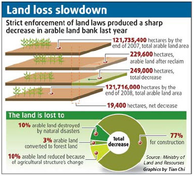 Updated: 2009-02-27 07:38 The rate of reduction of arable land in the country has slowed down considerably, signaling that the government's strict measures to save farmland is "working well", an official of the Ministry of Land and Resources said Thursday. "China's arable land decreased by 19,400 hectares last year, which is just a fraction of the annual reduction over the past decade," Zhang Pu, deputy director of the law enforcement and supervision bureau of the ministry, said at a press conference in Beijing. He added that the ministry will continue with its measures to safeguard some 120 million hectares of the country's farmland. Between 1997 and 2007, the annual average area of reduced arable land was 755,000 hectares. By the end of last year, the total arable land amounted to 121.7 million hectares, figures from satellite images covering 86 Chinese cities showed. The central government has said that the nation's arable land bank must not fall below 120 million hectares. "With satellite supervision of land misuse and strict land management measures, we made great achievements last year, with cases involving land misuse reducing by 37 percent and the area by nearly half," Zhang said. Strict control of land use, reduction of arable land converted to forest, and the effective management of unused land helped slow down the speed at which arable land was decreasing, said Wen Mingju, deputy director of the ministry's land ownership administration. More than 60,000 cases, involving illegal land use totaling 47,000 hectares, of which 17,600 hectares is arable, were recorded last year, statistics showed. The authorities also demolished illegal structures spread out on 26.5 million sq m of land, and meted out more than 2 billion yuan of fines, the ministry said. "Illegal land use has been under control, but a sharp conflict between land supply and demand still exists due to the increasing demand of land triggered by the government's 4-trillion-yuan ($580 million) stimulus package," Zhang said. "Besides the stringent land protection policy, satellite-imaging efforts to detect illegal land use will also be doubled to cover 172 cities this year," he said. The ministry will also strengthen cooperation with other government departments to ensure the quality and quantity of arable land, Zhang said.