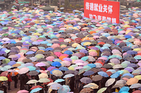 Updated: 2009-02-28 22:17 Job seekers holding umbrellas flock into a job fair at Hangzhou Peace International Convention & Exhibition Center, Hangzhou, East China's Zhejiang province, February 28, 2009. About 1,300 employers have set up stalls at the job fair that offers 26,000 jobs. [Xinhua] |