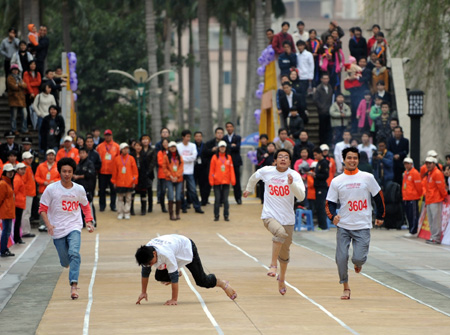 Updated: 2009-03-09 13:02 A man falls while running in high heels during a race at a shopping mall in Dongguan, south China's Guangdong province, March 8, 2009. The event attracted more than 400 people to mark International Women's Day. [CFP] |